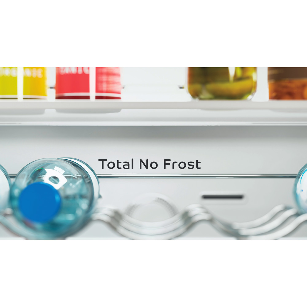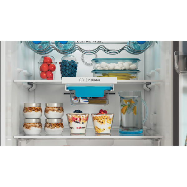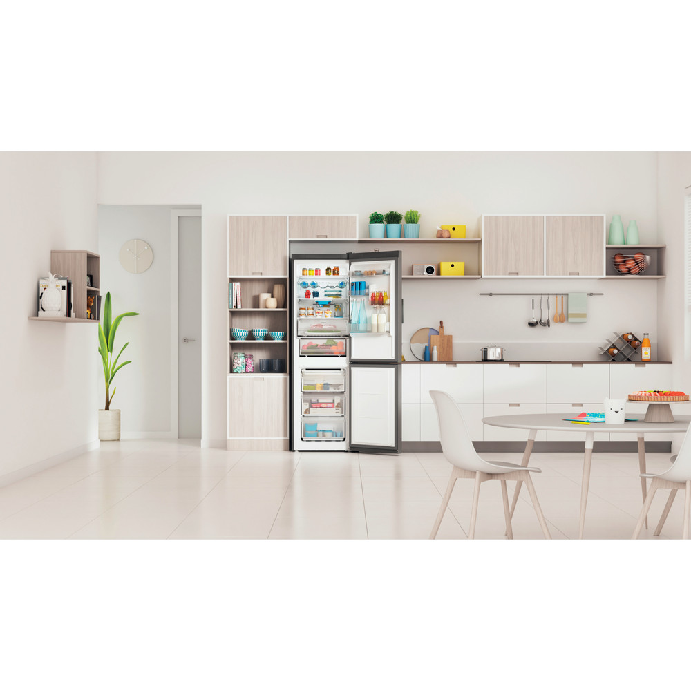 Indesit szabadonálló hűtő-fagyasztó jellemzői: egy magas készülék, mely megfelel a család igényeinek. Inox szín. Inox deisgn. No Frost, a fagymentes technológia, amely hatékonyan megakadályozza a jég felhalmozódását a készülékben a páratartalom csökkentésével. Üvegpolcok, a robosztusságért.
