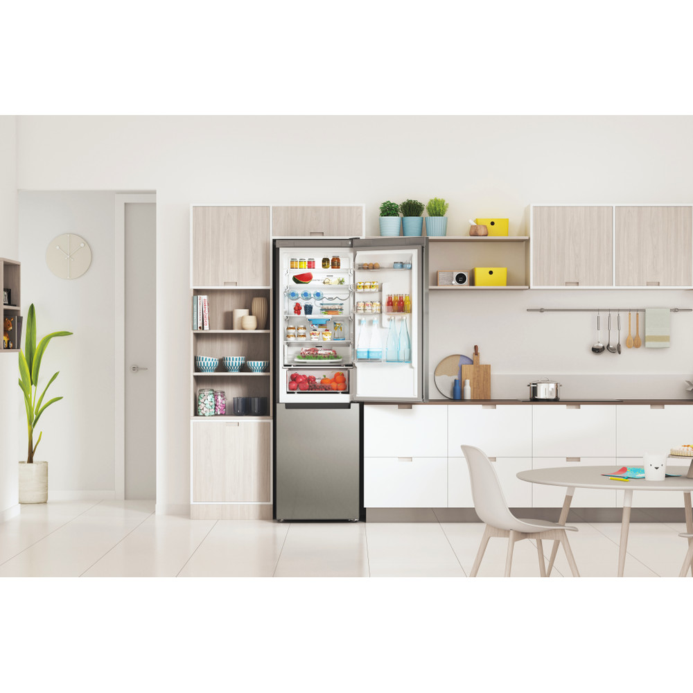 Indesit szabadonálló hűtő-fagyasztó jellemzői: egy magas készülék, mely megfelel a család igényeinek. Inox szín. Inox deisgn. No Frost, a fagymentes technológia, amely hatékonyan megakadályozza a jég felhalmozódását a készülékben a páratartalom csökkentésével. Üvegpolcok, a robosztusságért.